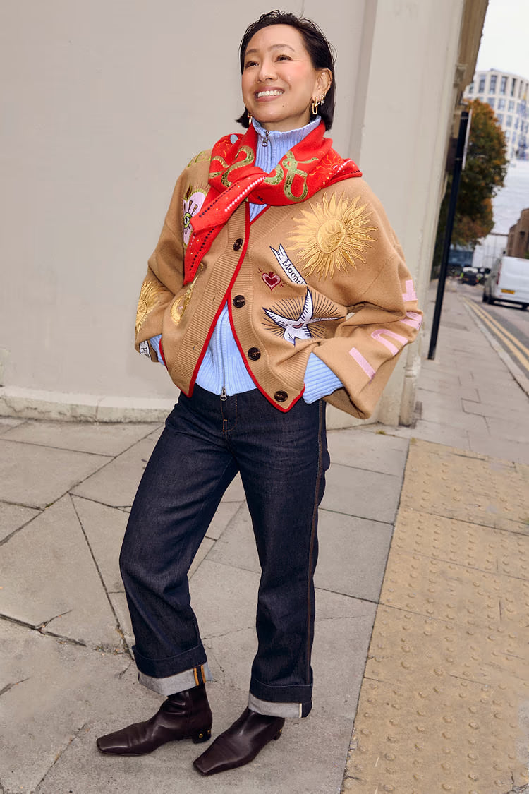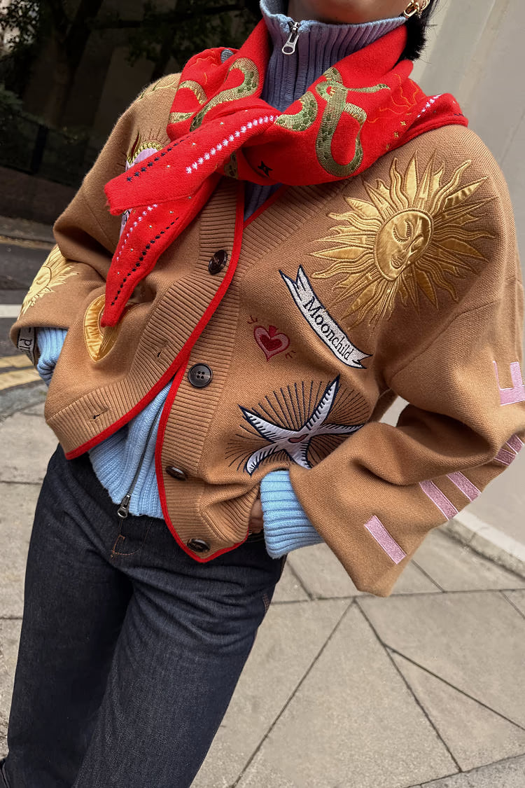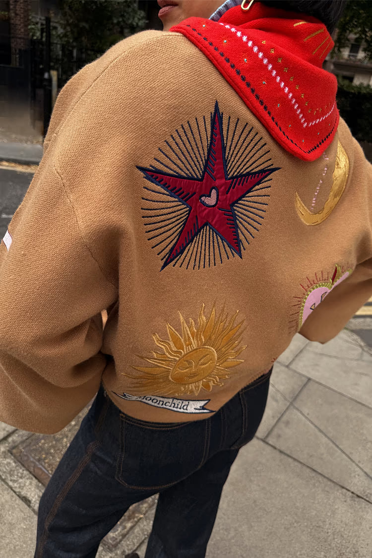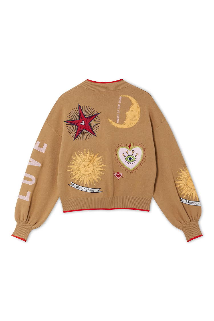 Una manta ligera para las noches frescas, con dobladillos acanalados más gruesos que le dan una silueta ligeramente estilo bomber. El tejido de punto es muy suave al tacto y se siente pesado, cubriendo la estructura con elegancia. Los hermosos motivos bordados, inspirados en los acentos dorados y plateados, se acompañan de grabados de soles y lunas que se pueden encontrar en los zocos de Marrakech .