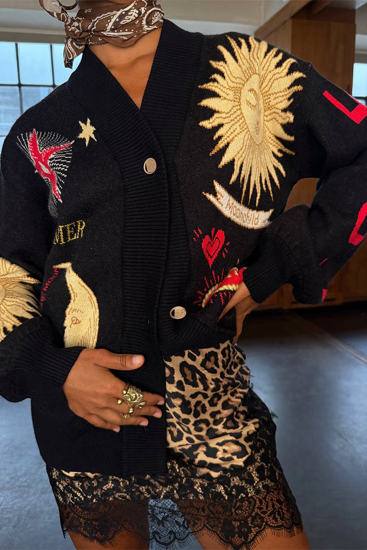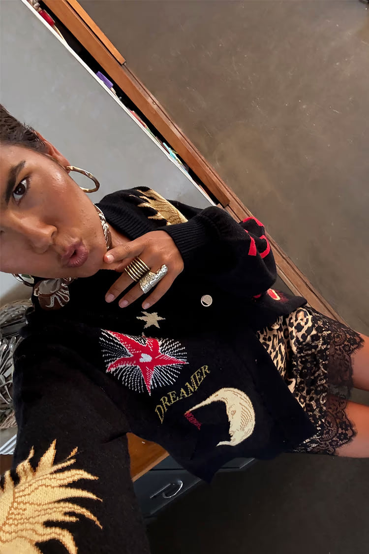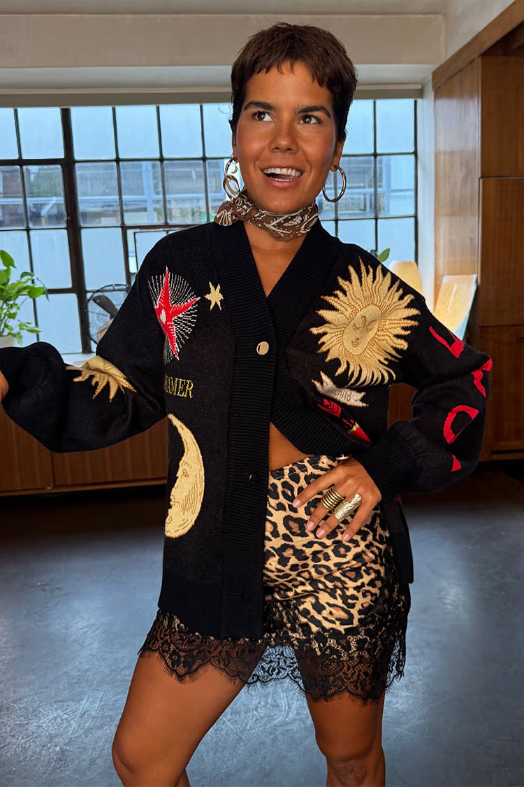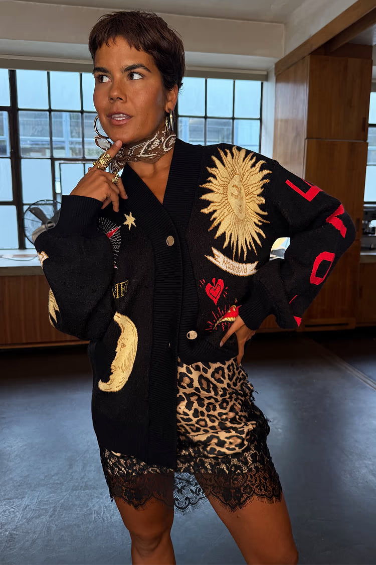 Una manta ligera para las noches frescas, con dobladillos acanalados más gruesos que le dan una silueta ligeramente estilo bomber. El tejido de punto es muy suave al tacto y se siente pesado, cubriendo la estructura con elegancia. Los hermosos motivos bordados, inspirados en los acentos dorados y plateados, se acompañan de grabados de soles y lunas que se pueden encontrar en los zocos de Marrakech .